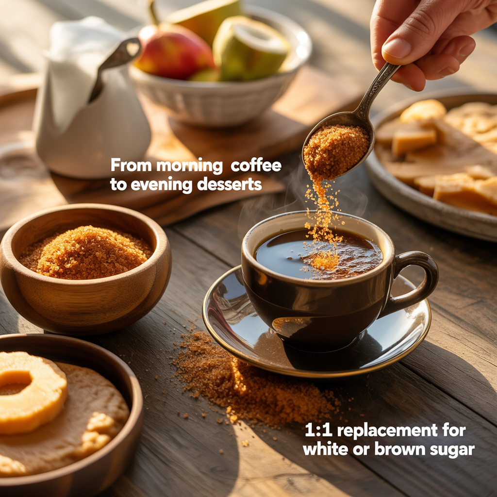 Stir coconut sugar into your morning coffee, tea, hot chocolate, or chai latte. It dissolves easily in hot liquids and adds a subtle caramel sweetness that complements warm drinks perfectly. Start with 1 teaspoon and adjust to your taste preference.